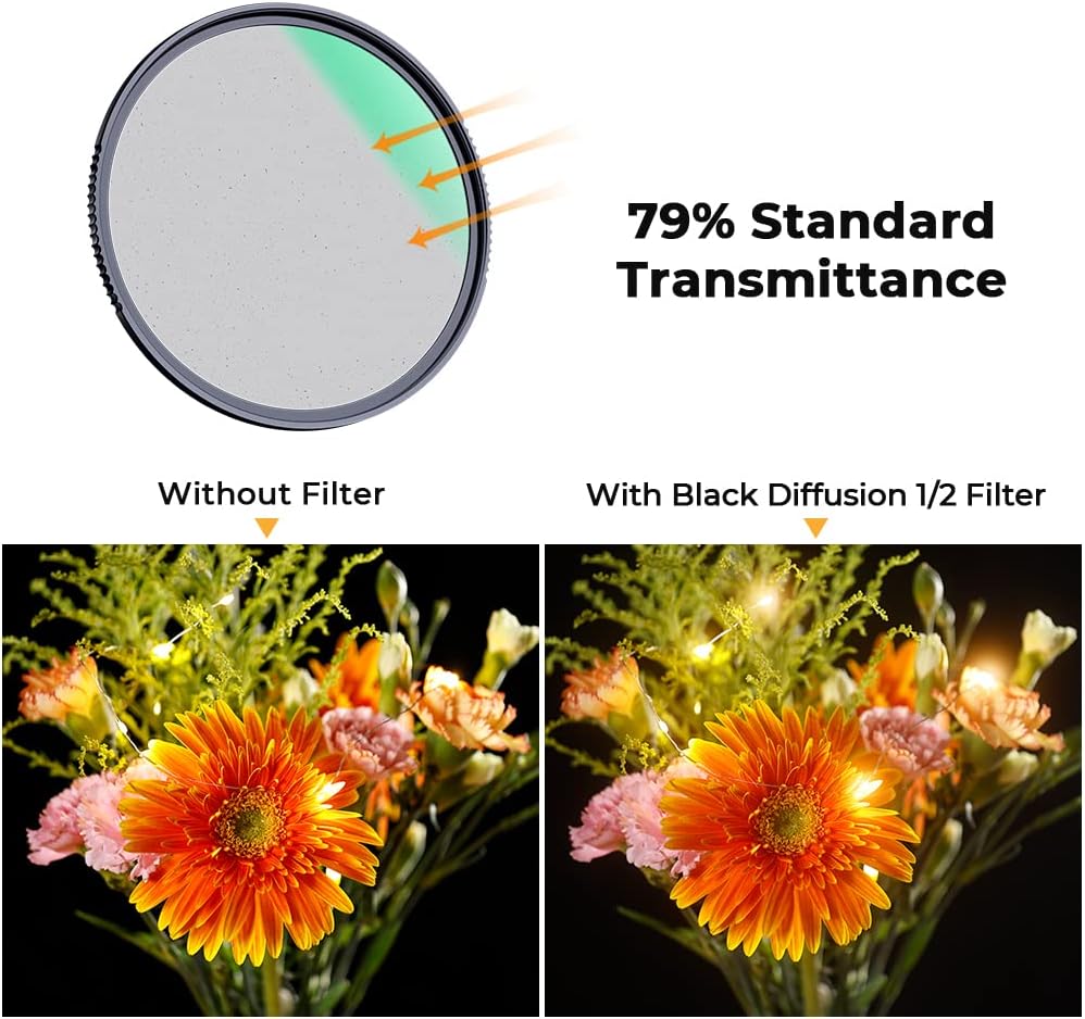 • 【Soften Highlight Glare, Lowered Contrast】The K&F Concept 1/2 black diffusion filter makes the picture or video light soft and controls highlight flares, making skin or pores more delicate, double side polishing technology ensures high definition within 550mm focal length. Old and new packaging will be distributed randomly, with no changes to the product contents.