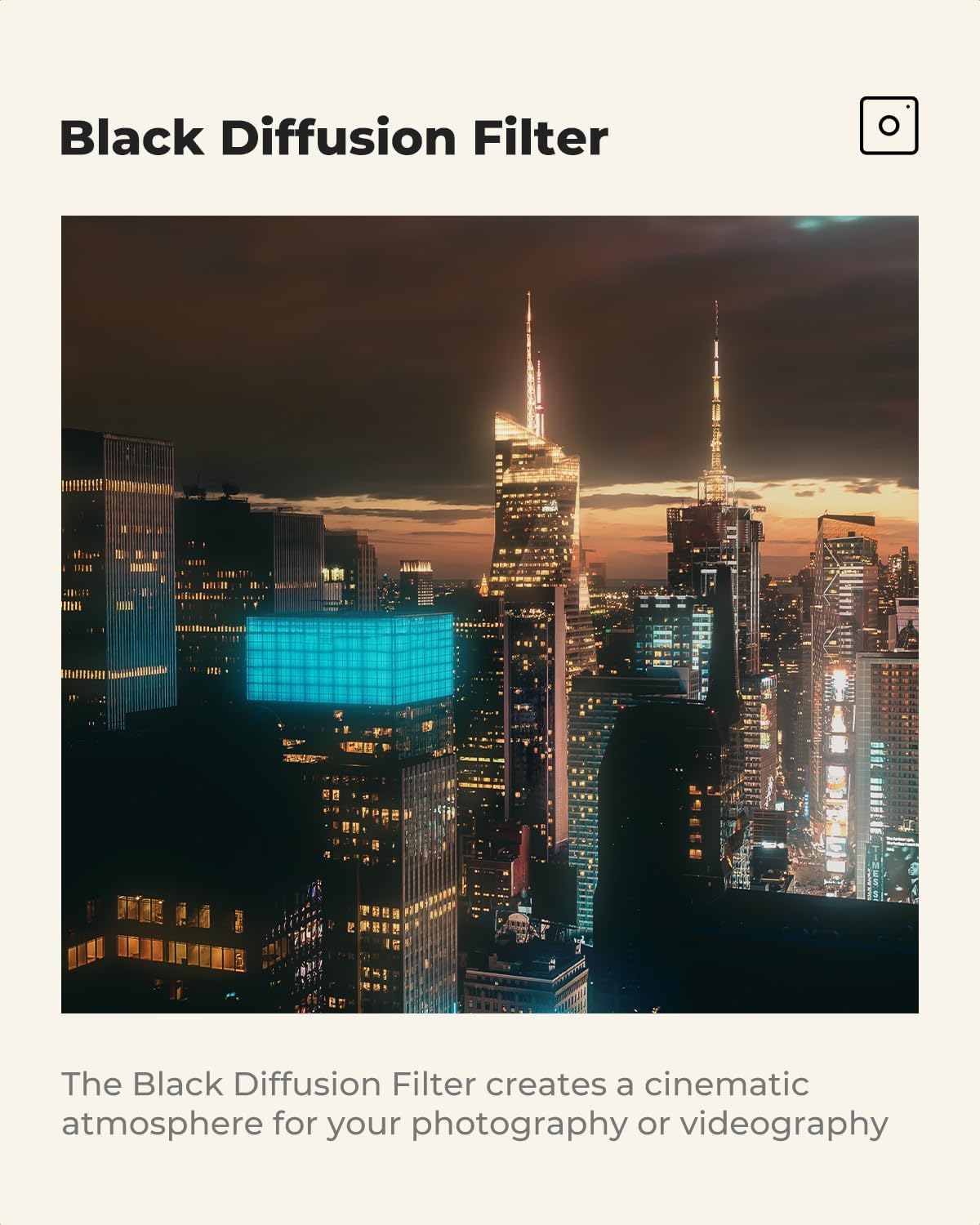 - 【Soft Highlight Flares, Lowered Contrast】This black diffusion 1/4 filter could soften facial skin's wrinkles, freckles, and pores, making it more delicate, plump, and gorgeous. The mist film effect can be better realized, showing the film effects dreamily.