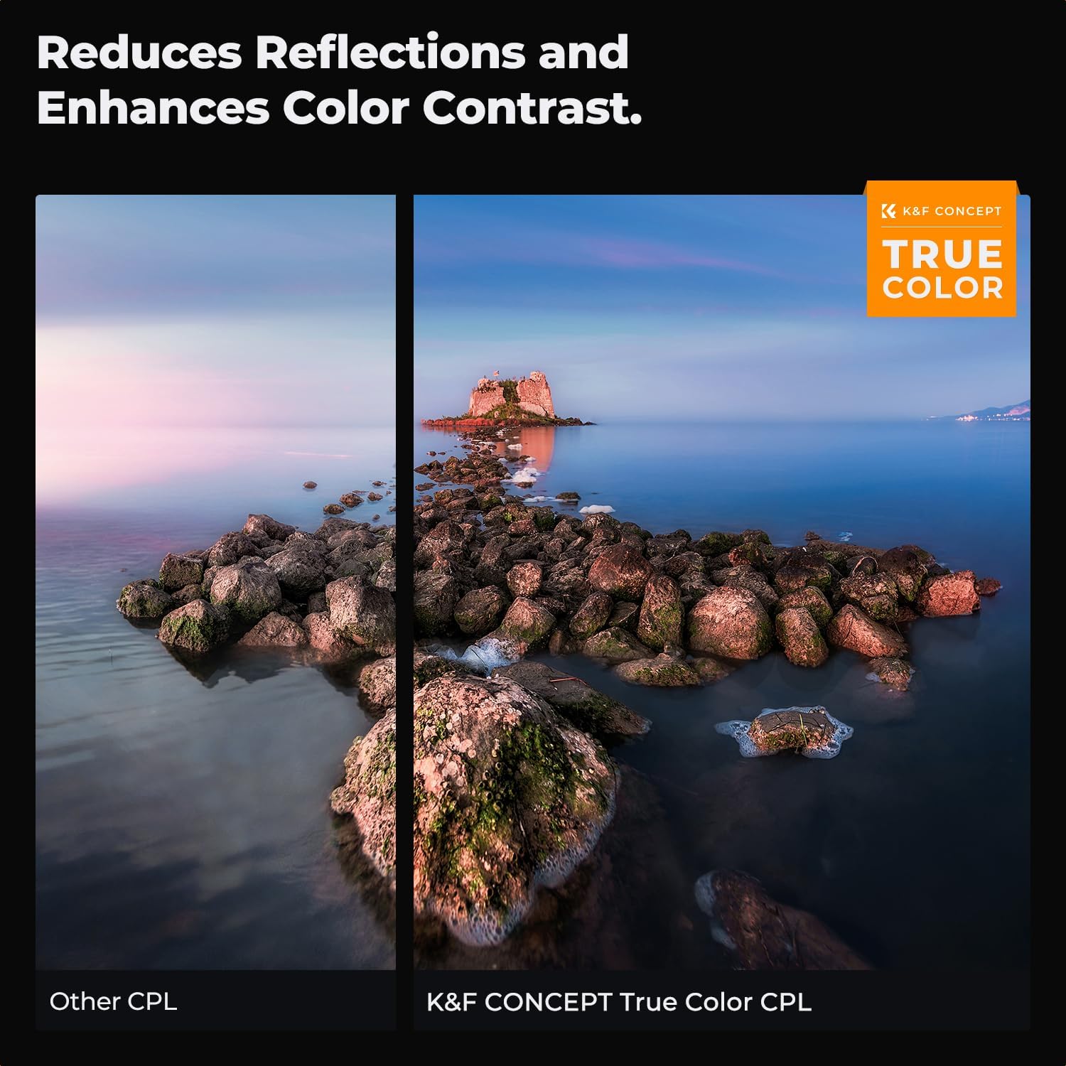 - 【Variable ND & CPL filter in 1】One filter has the ND and CPL filter features, it can not only control the amount of light entering the lens to darken skies but also avoid unwanted reflections coming from non-metallic, such as water, and glass. Enhance the color and contrast. Old and new packaging will be distributed randomly, with no changes to the product contents.