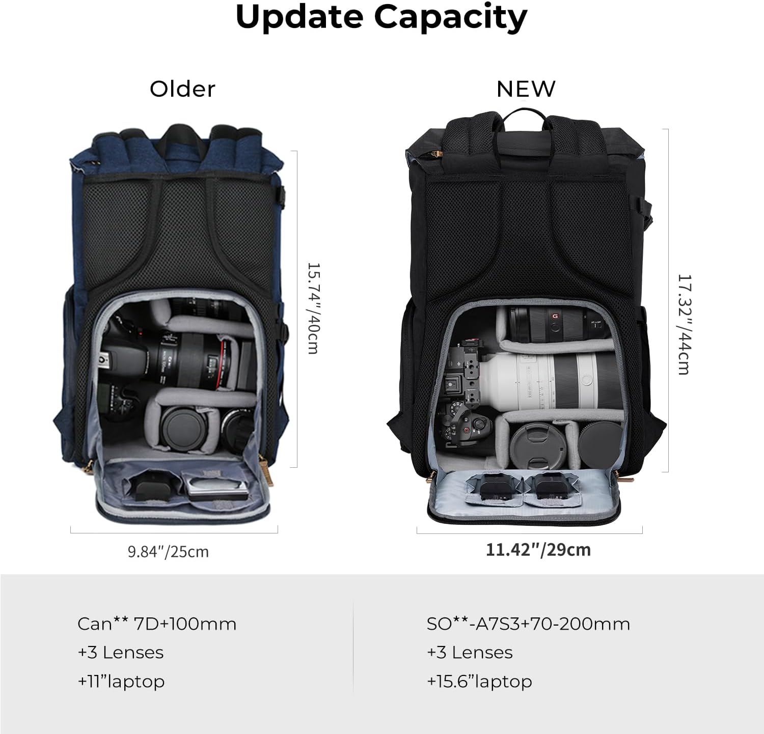 - 【Capacity Upgrade】9.84"*6.29"*15.74"; This camera backpack can hold 1 camera + 3 lenses+ 7-11'' iPad+ Tripod,and other photo essentials.
