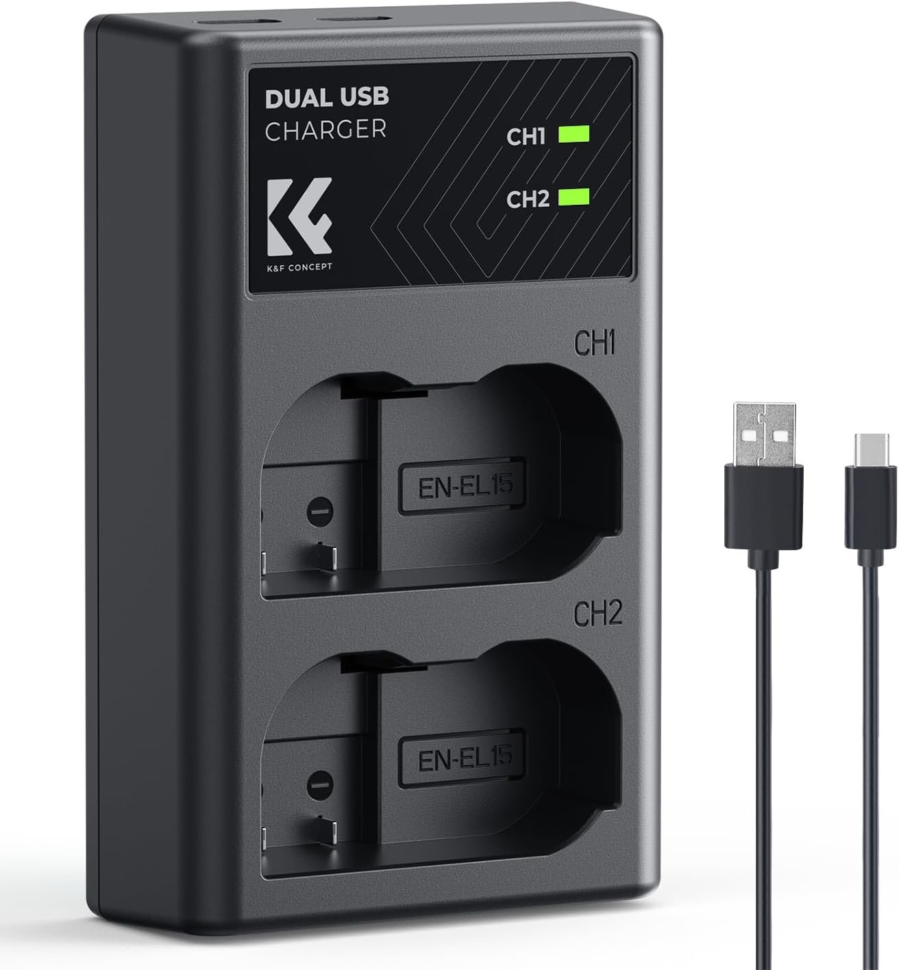 EN-EL15/15A/15B/15C Dual Slot Quick Battery Charger, Micro USB and Type-C Charger
