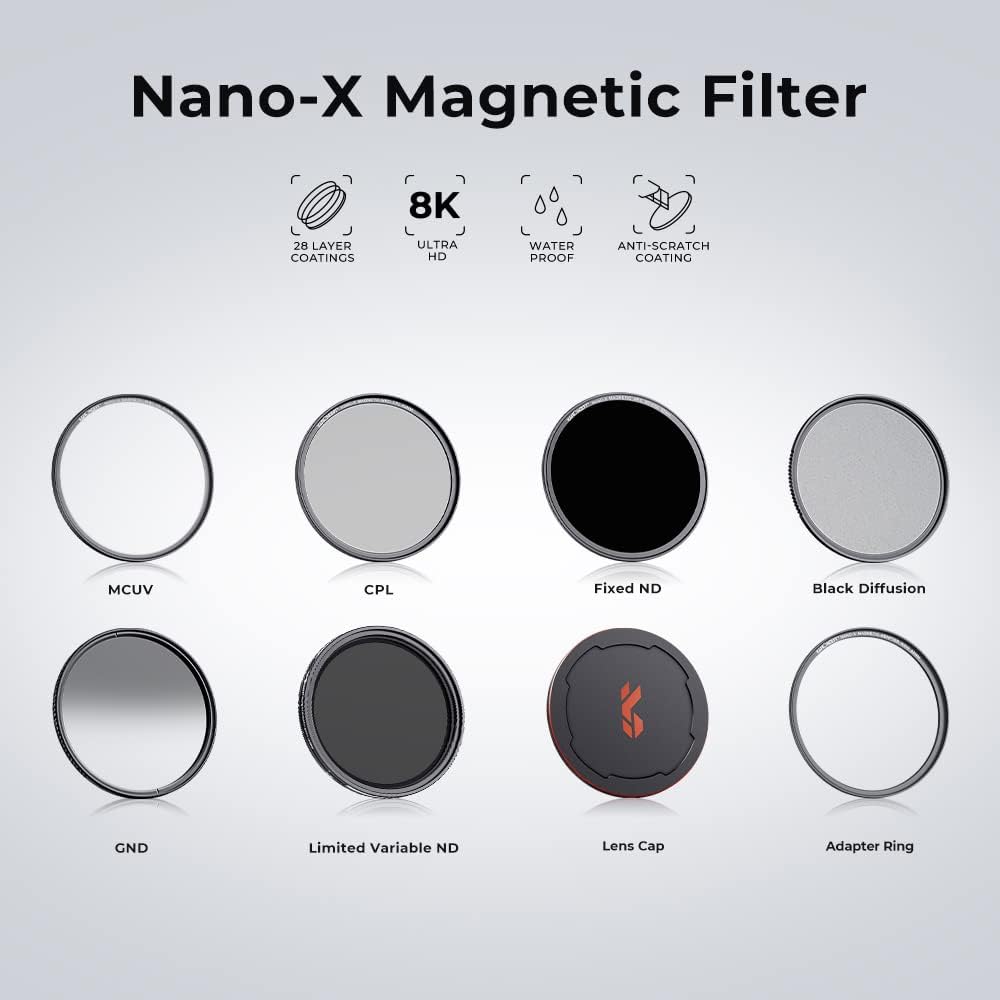 - 【Magnetic ND8 Filter】K&F Concept Fixed ND8 Filter (3 Stop) lets you capture motion blur depth of field effects. Great for landscape photography and cinematic effects in videography.