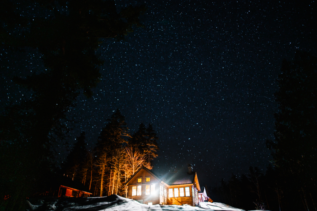 Gorman Chairback Lodge in the AMC Maine Woods International Dark Sky Park. Buildings in Dark Sky Places adhere to a set lighting plan. Photo by Cait Bourgault.