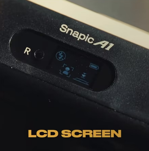 On the upper right corner of the front, there's a built-in flash and lens. The "Snapic A1" logo below it seems to be directly painted on. However, there's a small light on the left side, possibly the flash photosensor.